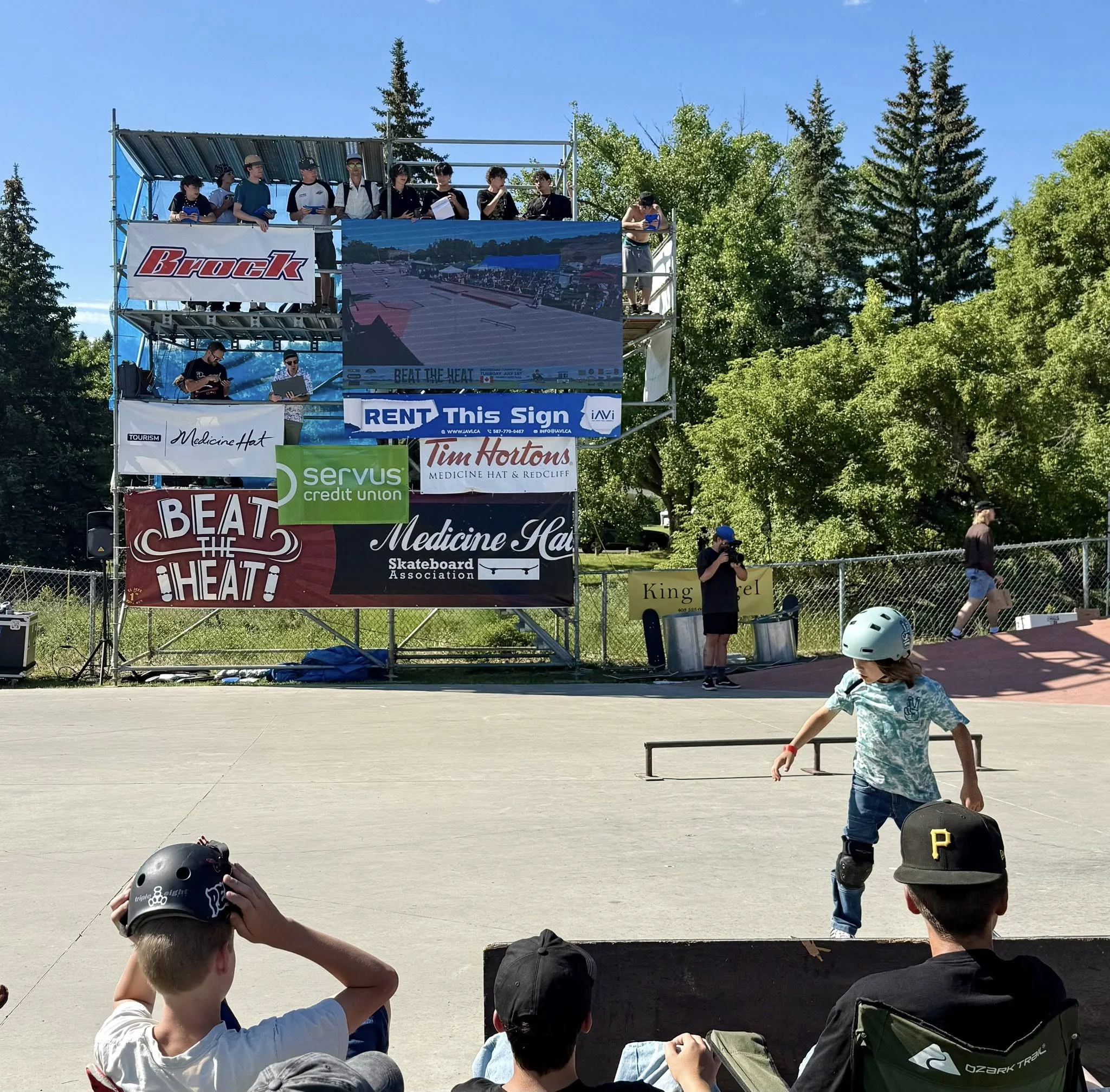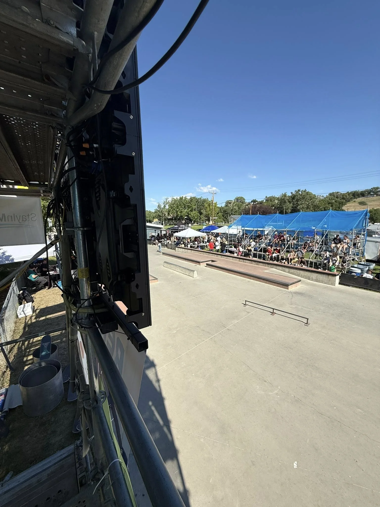 Ultra-bright outdoor video wall + tuned event audio for a wide, sunlit park—clean playback for sponsor loops and schedules, with clear MC coverage across the bowl.